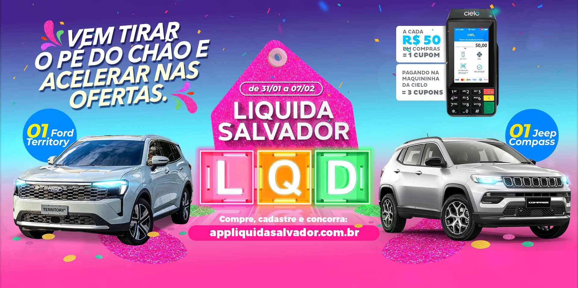 A Cielo traz a vantagem que faltava para você ganhar na Liquida Salvador. Além de tecnologia e segurança para os lojistas, a Cielo oferece um benefício extraordinário para você: use a Cielo no pagamento e ganhe 3 cupons de uma vez só. Isso mesmo: pagando na maquininha, você triplica suas chances de ganhar! É a chance perfeita de acelerar na direção do seu carro novo. Tire o pé do chão e triplique sua sorte para levar para casa um Jeep Compass ou um Ford Territory zero km!