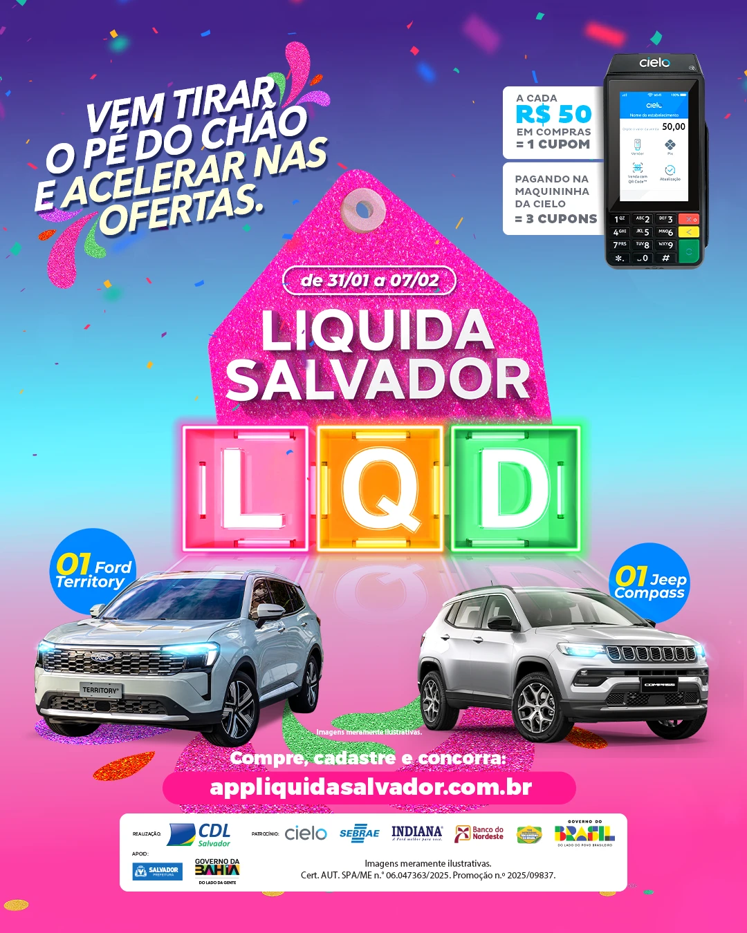 Vem tirar o pé do chão e acelerar nas ofertas da Liquida Salvador 2026! A 28ª edição da maior campanha promocional da cidade chegou com tudo. De 31 de janeiro a 07 de fevereiro, aproveite descontos reais em lojas de rua e shoppings de toda a região. Além de economizar, a cada R$ 50 em compras você garante um cupom para concorrer a dois SUVs de luxo: um Jeep Compass Sport e um Ford Territory Titanium. Não perca tempo, cadastre suas notas e acelere sua sorte. Compre e concorra!