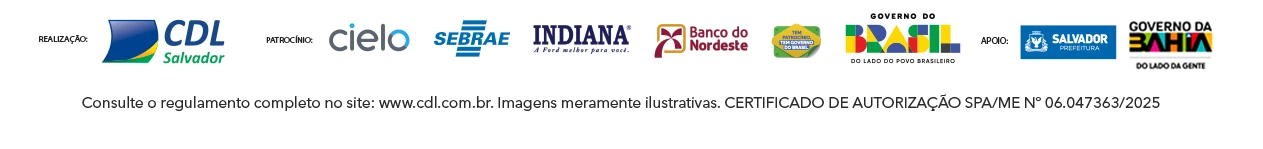 Imagens meramente ilustrativas. Promoção válida para compras realizadas nas lojas participantes, no período de 31/01/2026 até 22h de 07/02/2026. No entanto, será possível cadastrar as notas fiscais das compras realizadas no período de participação da campanha, pelo site oficial da promoção (appliquidasalvador.com.br), até o dia 13/02/2026. Sorteio será realizado no dia 24/02/2026. Consulte o regulamento completo no site: www.cdl.com.br. CERTIFICADO DE AUTORIZAÇÃO SPA/ME Nº 06.047363/2025