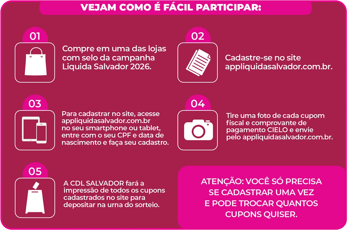 1 - Valor mínimo da nota: R$ 50,00; • 2 - O saldo não é acumulativo. Caso tenha nota fiscal no valor de R$ 80,00, o sistema irá gerar 1 cupom e deletar o saldo restante; • 3 - O cadastro das notas fiscais pelo appliquidasalvador.com.br deverá ser efetuado no período de participação, por meio de qualquer meio de pagamento. Para comprovar as compras processadas pela CIELO, será exigida a foto do comprovante de compra do cartão (via do cliente), além do cupom ou nota fiscal da compra; • 4 - Não será permitido somar notas, independentemente da quantidade delas; • 5 - O nome da loja da nota fiscal cadastrada será impresso no cupom. Pergunta e resposta: Qual é a maior promoção do comércio de Salvador? ( X) Liquida Salvador 2026 ( ) Outras